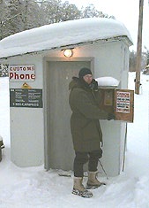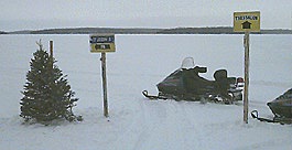 At the start. One trail leads to St. Joseph. The other to Thessalon.As soon as the ice freezes to a safe thickness, the folks on Drummond Island and the neighboring Canadian communities of St. Joseph Island and Thessalon get together and build a Christmas tree line across the frozen ice to connect the various communities. The trees are spaced one tenth of a mile apart. They mark the route from the US to Canada and prevent snowmobilers from getting lost while traveling in snowstorms and at night.